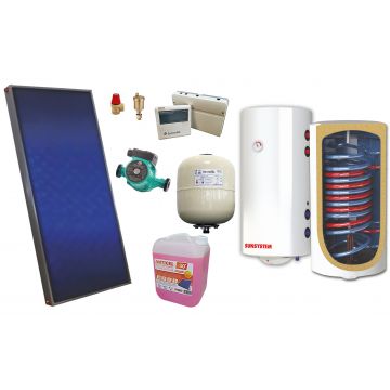 Sistem solar presurizat, panou solar plan Sunsystem PК SL FP 2.0, boiler cu 2 serpentine si rezistenta electrica Sunsystem 100 litri, pompa 25-60, controller, vas expansiune, antigel, supapa 1/2, aerisitor 1/2